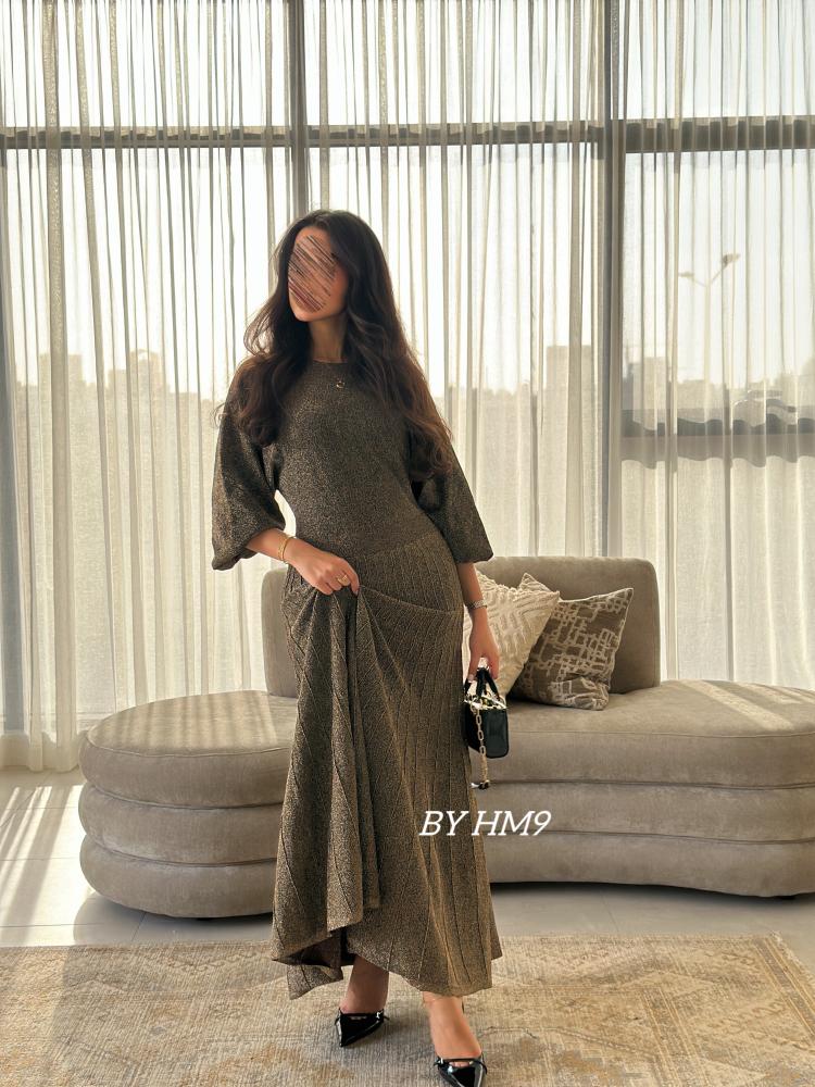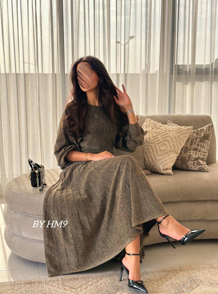 يعكس الأناقة الكلاسيكية بتصميم عصري. يتميز بقصته الانسيابية التي تحتضن قوامك برقة، مصنوع من قماش ناعم يلمع بأناقة، يتزين بتفاصيل ذهبية داكنه دقيقة تضفي عمقًا بصريًا رائعًا.