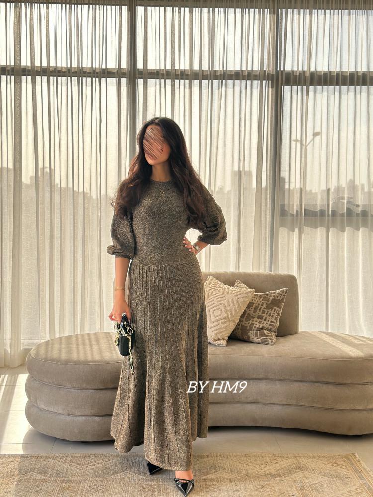 تجذب الأكمام المنفوخة الأنظار، حيث تضفي لمسة من الجاذبية وتبرز المعصمين بطريقة أنيقة. الجزء العلوي من الفستان مصمم بشكل مميز، بينما ينحدر الفستان بحرية من الخصر ليضفي إحساسًا بالراحة والحركة.
