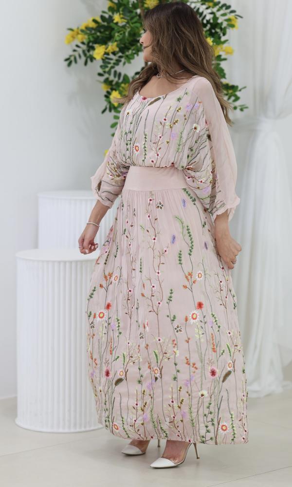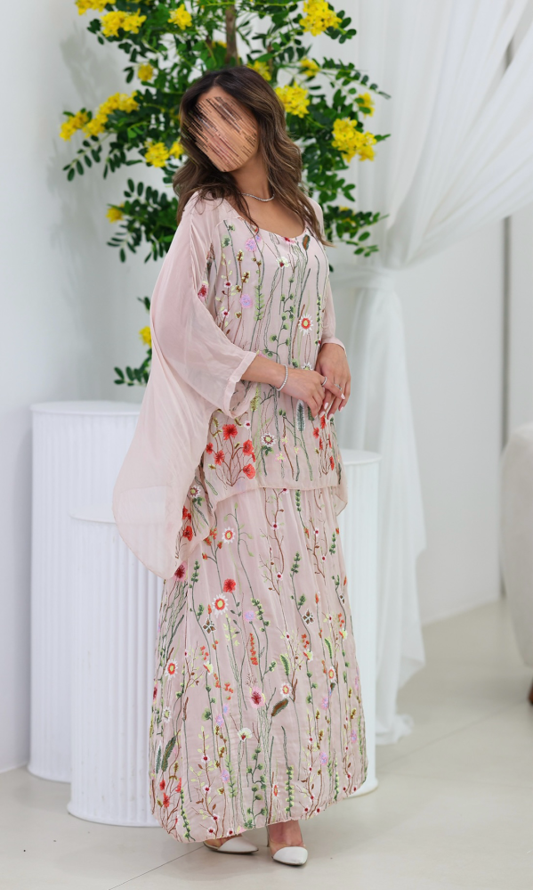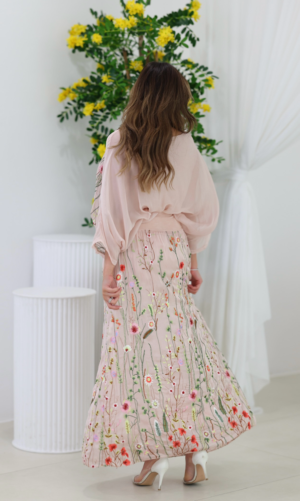 طقم مكوّن من قطعتين مصنوع من قماش الحرير الفاخر ببطانة داخلية من القطن لضمان الراحة. الجزء العلوي يأتي بقصة فضفاضة وانسيابية بأطراف غير متماثلة، يتميز الطقم بتطريز متقن يغطي كامل التصميم برسومات أزهار ملونة مستوحاة من الطبيعة، بألوان متعددة، كالأحمر، البنفسجي، والزهري، تضيف لمسة فنية هادئة تشبه الزخارف. أما التنورة تأتي بخصر قطن مطاطي وطول متوسط تضفي حركة وانسيابية ناعمة عند المشي.