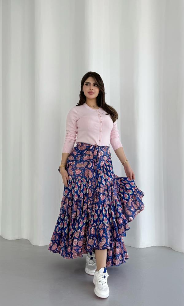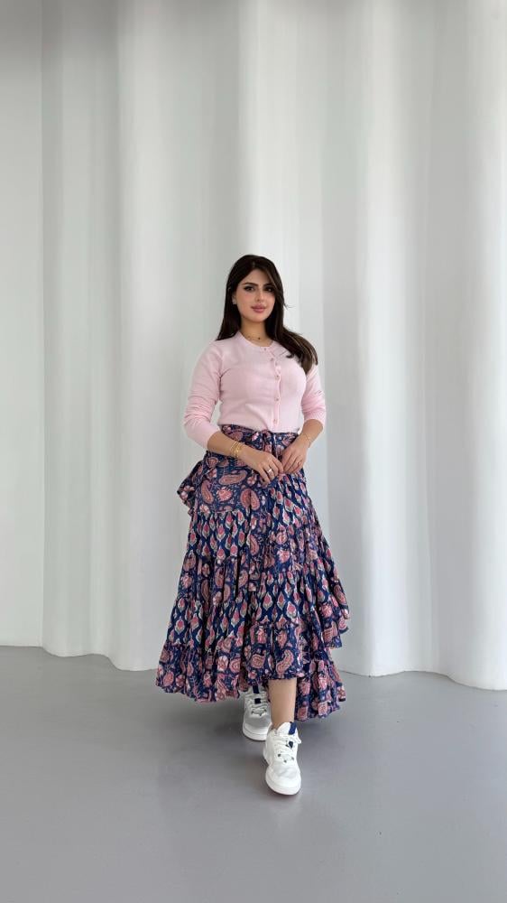 تنورة قطنية بتصميم لفّ (Wrap Skirt) تُربط حول الخصر بطريقة أنثوية أنيقة. تتميّز بقماشها القطني المريح والمزيّن بنقوش الورد على خلفية باللون الأزرق مما يمنحها طابعًا أنيقاً وانتعاشًا بصريًا. يُبرز تصميمها الطبقات المتدرجة (الكشكش) حركة انسيابية جميلة أثناء المشي كما يضيف الخصر العالي وطريقة اللف لمسة أنثوية تُبرز القوام بطريقة راقية وغير متكلّفة.