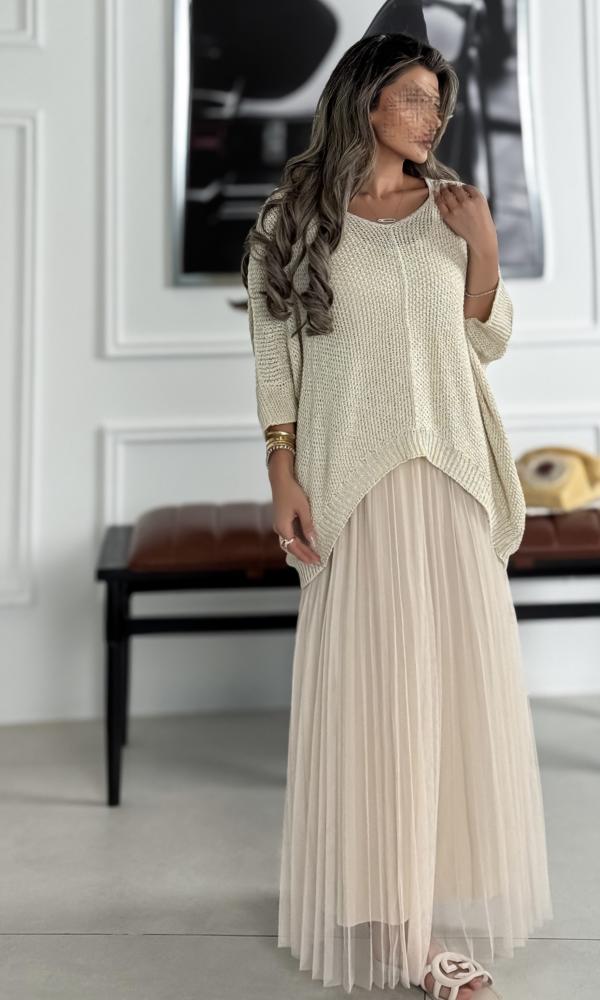 قطعه فنيه مكونه من جزئين، حيث يجسد الأناقة الصيفية بكل تفاصيلها الفستان الداخلي بدون أكمام مصنوع من قماش سترتش ناعم، مما يوفر راحة لا مثيل لها، بينما يضيف الشيفون الخفيف المكسر طبقات من الحركة والرقة، مما يجعل كل خطوة تعكس أناقة فريدة، مع خصر بمغاط مريح ، وتأتي القطعة العلوية كغطاء سحري، مصنوعة من قماش تريكو مرن، تبرز جمال التصميم وتمنحك شعورًا بالحرية. بفضل تصميمه العصري، يتيح لك هذا الفستان التمتع بإطلالة أنيقة دون عناء