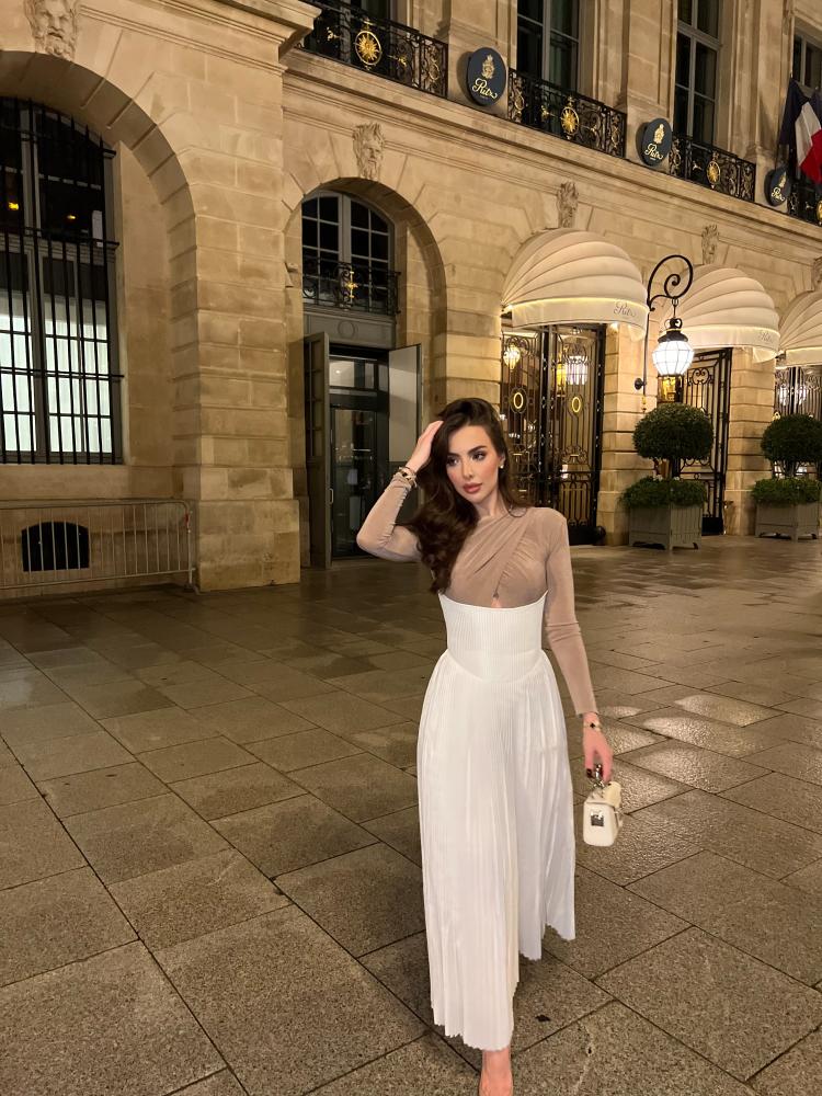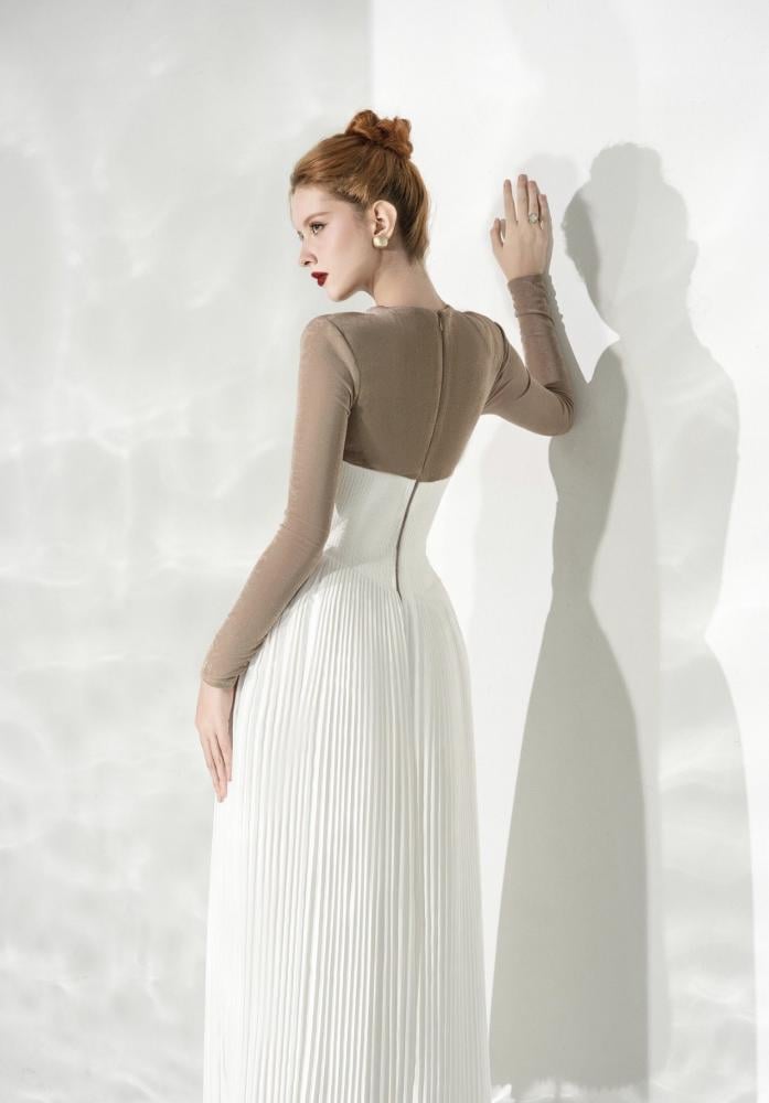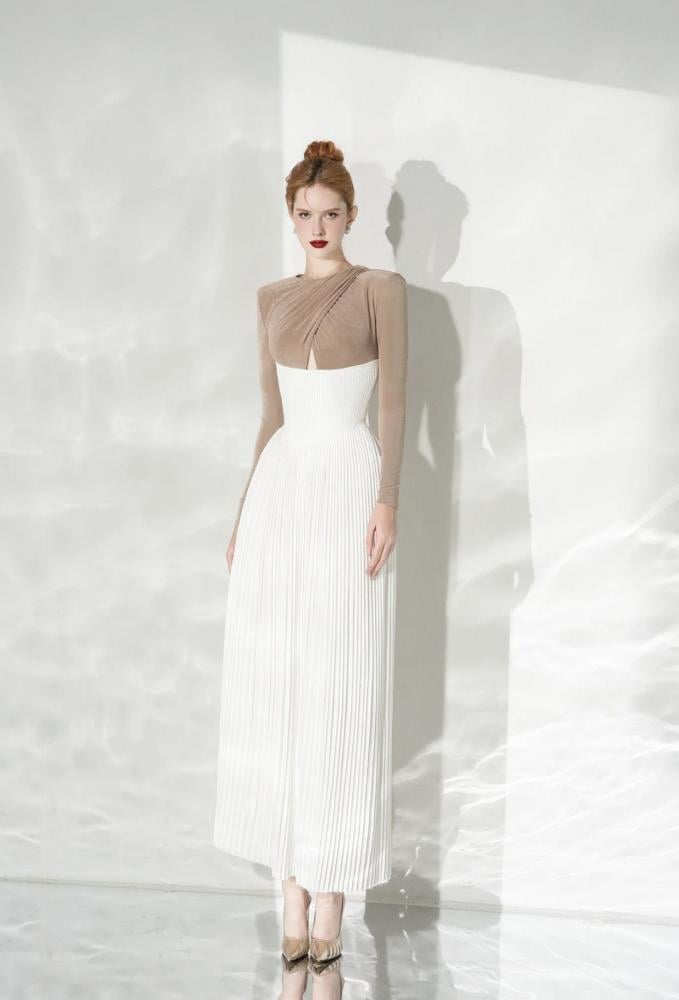 أما الجزء السفلي فهو مصنوع من كسرات ساتان مطويه، مما يمنح الفستان حركة رائعة عند المشي ويضيف لمسة من الفخامة. الألوان المتباينة بين الجزء العلوي والسفلي تعزز من جمال التصميم، مما يجعله خيارًا مثاليًا للسهرات الخا