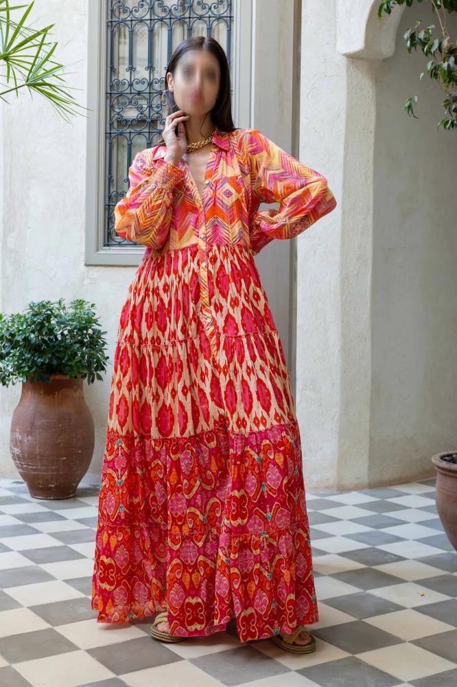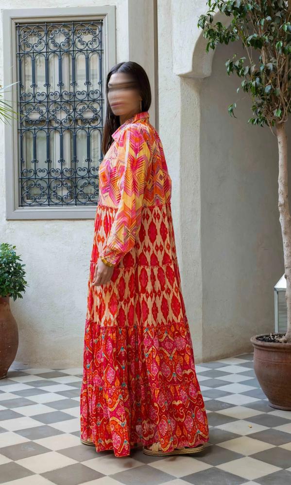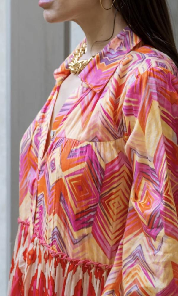 فستان صيفي ماكسي مصنوع من قماش القطن يتميز بقصة واسعة مريحة بطبقات ناعمة تضيف حركة وأناقة يأتي بنقشة هندسية جذابة بألوان زهرية وفوشيا وبرتقالي مع أكمام طويله.