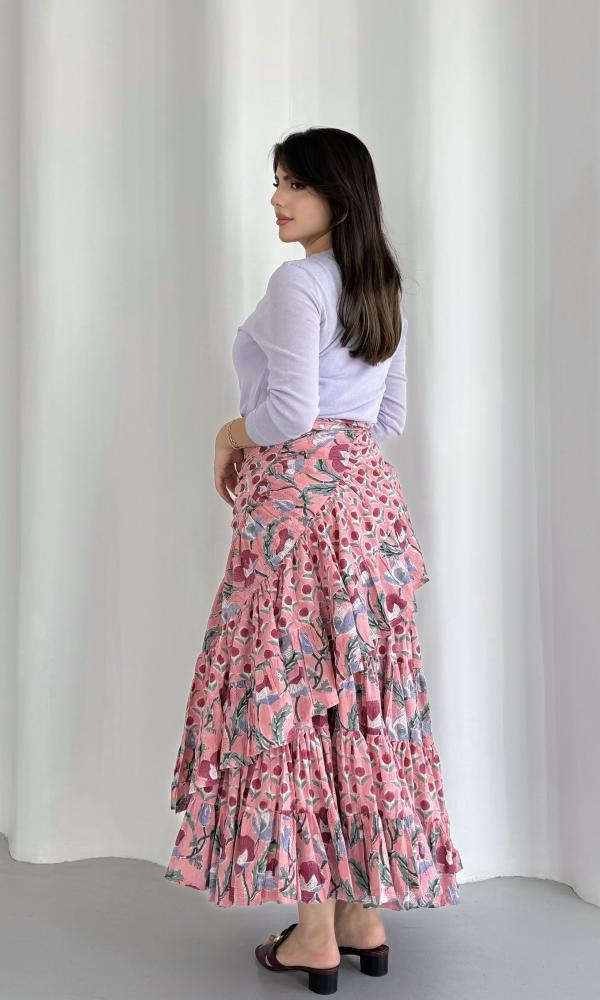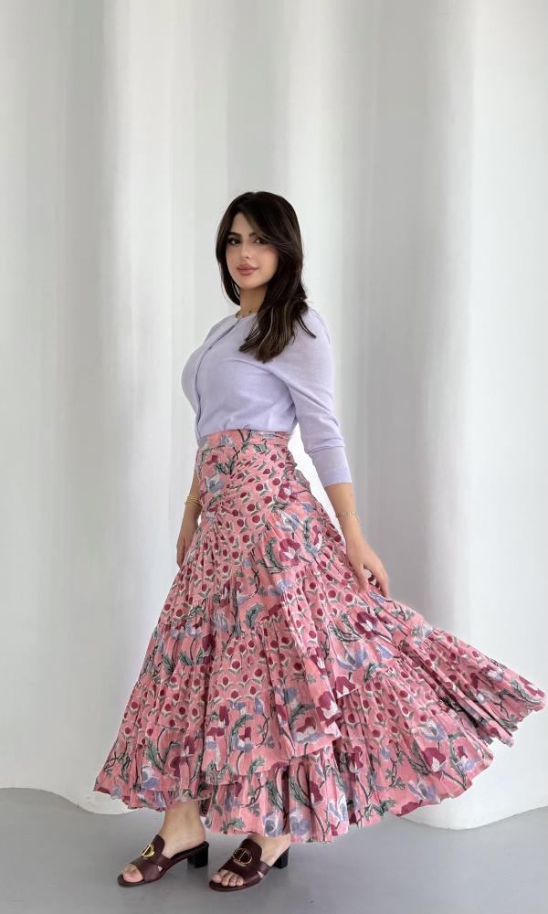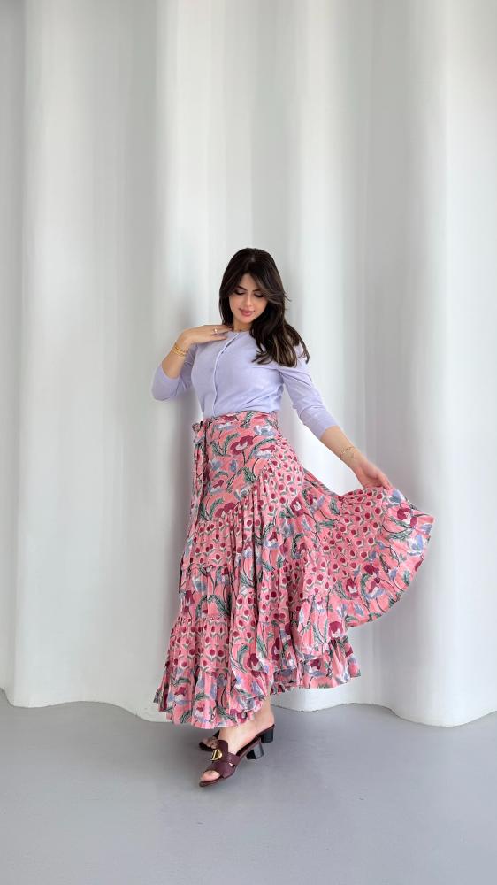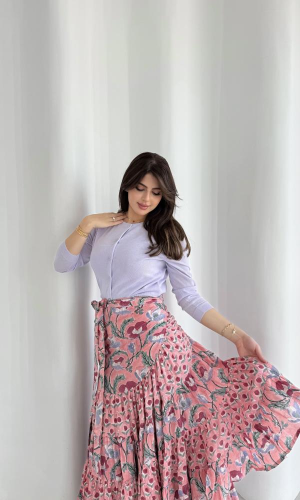 تنورة قطنية بتصميم لفّ (Wrap Skirt) تُربط حول الخصر بطريقة أنثوية أنيقة. تتميّز بقماشها القطني المريح والمزيّن بنقوش الورد على خلفية باللون الوردي مما يمنحها طابعًا أنيقاً وانتعاشًا بصريًا. يُبرز تصميمها الطبقات المتدرجة (الكشكش) حركة انسيابية جميلة أثناء المشي كما يضيف الخصر العالي وطريقة اللف لمسة أنثوية تُبرز القوام بطريقة راقية وغير متكلّفة.