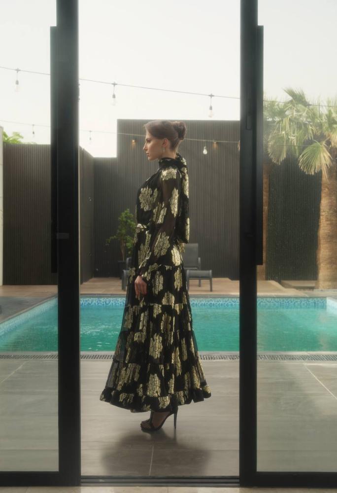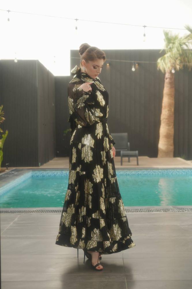 فستان اسود مشجر مصنوع من قماش شيفون أسود مزيّن بطبعات ذهبية لامعة، تتناثر بشكل فني على القماش، يتميز بتصميمه الأنيق مع حزام يحدد الخصر، الأكمام طويلة وفضفاضة، تأتي ربطة العنق بشكل مميز حول العنق، ويمكن ارتداؤها بطرق متعددة، مما يتيح لك تغيير إطلالتك بسهولة، الفستان يمتد إلى الأسفل بتصميم متدفق، مما يعكس الحركة بشكل جميل، مما يجعله خيارًا مثاليًا للمناسبات الرسمية.