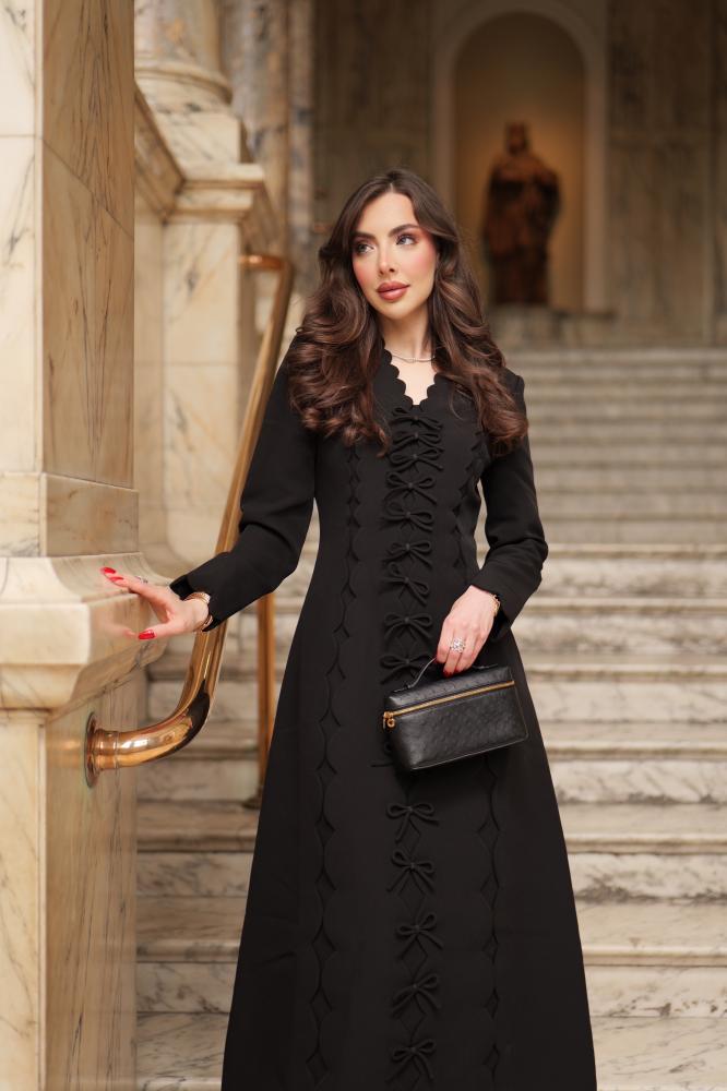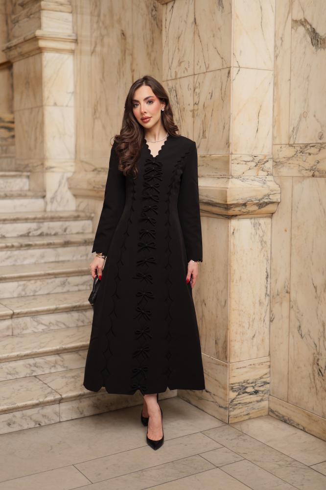يتميز بخط طولي من الفيونكات المصممة بدقة لتضفي لمسة ناعمة دون مبالغة، اللمسات المنحوتة على الياقة والحواف تمنح الفستان طابعاً فنيًا يعكس دقة التصميم واهتمامه بالتفاصيل،أما الأكمام الطويلة المستقيمة فتمنح حضورًا واثقًا يلائم الإطلالات الرسمية والمناسبات الراقية مصنوع من كريب عالي الجودة، يضمن ثبات القَصة وانسيابية الحركة مع كل خطوة.