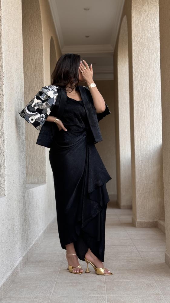 تألقي بسحر لا يُضاهى مع فستان بلاك شارم، هذا التصميم الاستثنائي المكون من قطعتين يجسد قمة الأناقة العصرية الكلاسيكية و الفخامة الراقية. تتألق القطعة الداخلية بفستان أسود ملكيبقصة ضيقة من خامة الساتان الثقيل الفاخرة، يمنحكِ ملمسًا حريريًا فخمًا ويبرز قوامكِ الأنيق بجمال لا يضاهى. يتميز الفستان الداخلي بقصة في غاية الرقي والجاذبية مع طيات دقيقة متقنة تتجمع بأناقة حول منطقة الخصر، لتمنحكِ مظهرًا أنثويًا ساحرًا و قوامًا رشيقًا. أما القطعة الخارجية فهي كيب فاخر من نفس خامة الساتان الثقيل، يضفي لمسة ملكية آسرة على الإطلالة،