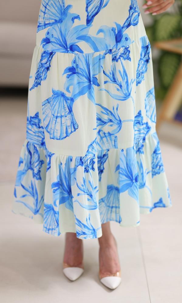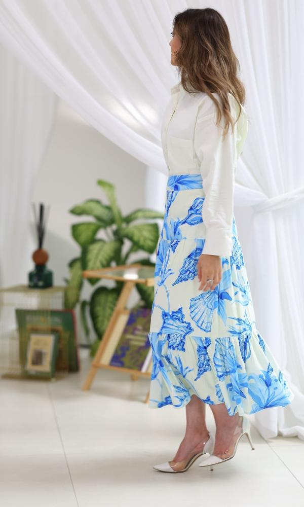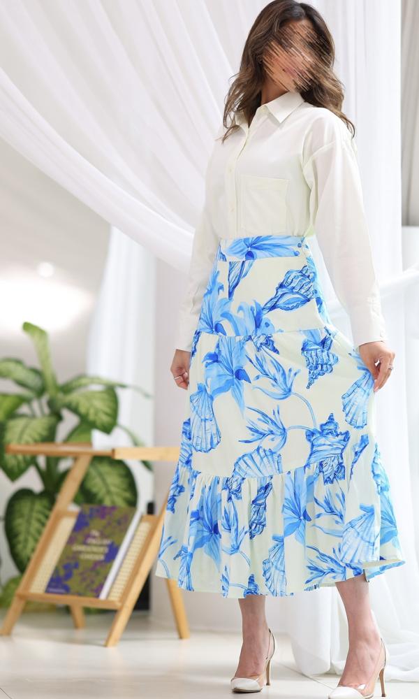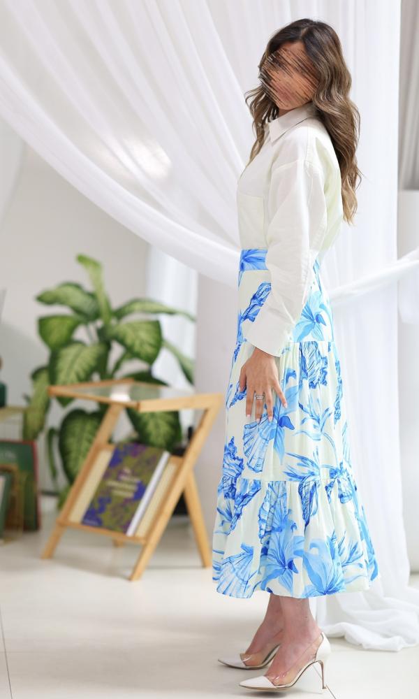 القميص السُكري الكلاسيكي يمنح لمسة من النعومة والعملية، بينما تضيف التنورة الميدي ذات الطبعة البحرية بالأزرق الحيوي إحساسًا بالانتعاش والحيوية. الطبعات المستوحاة من الأصداف والأوراق تجعلها قطعة مثالية للأجواء الصيفية والقصة الواسعة مع الكسرات السفلية تعطي حرية في الحركة وانسيابية أنثوية.