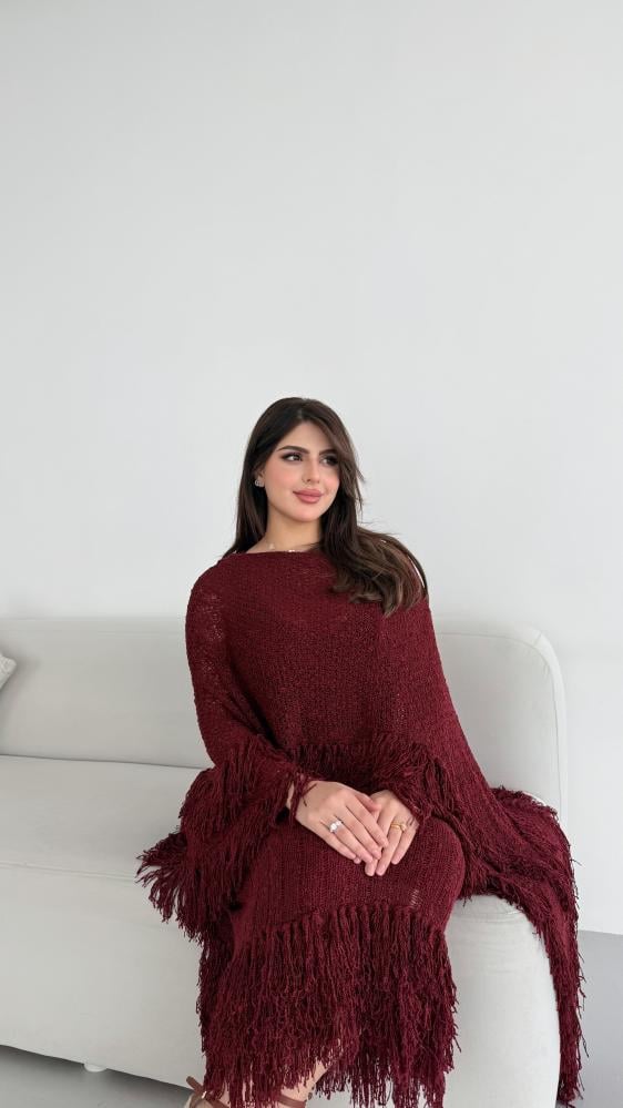 فستان من الصوف الناعم بتصميم مكوّن من فستان وكيب منفصل، مزين بهدب كثيف عند الأطراف يضفي لمسة دفء وأناقة، مع بطانة قطنية مريحة بلون متناسق لإطلالة شتوية فاخرة.