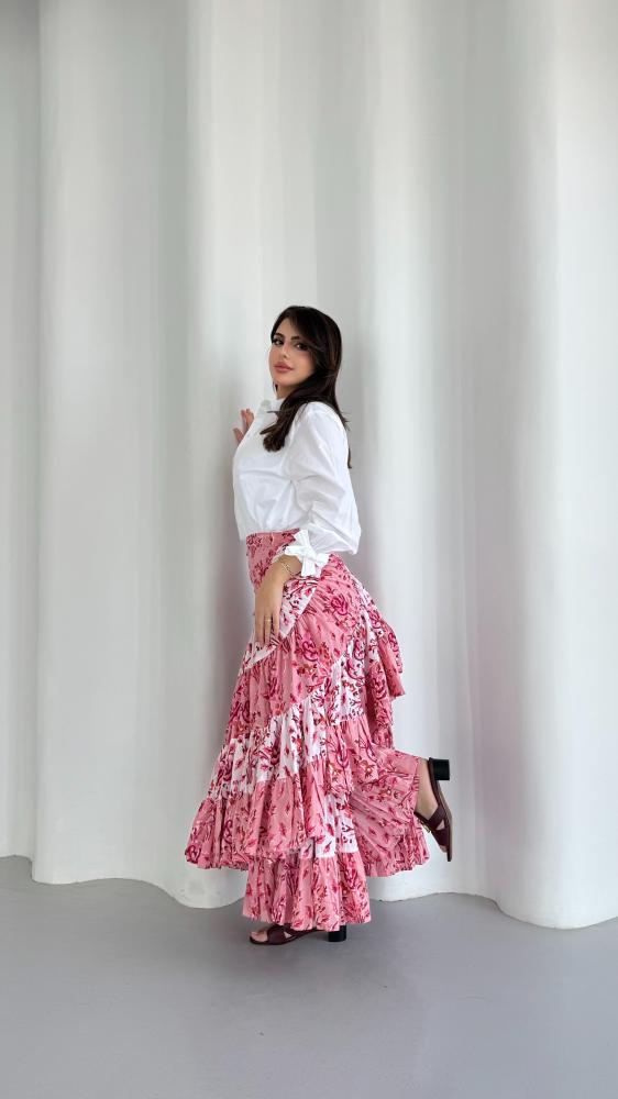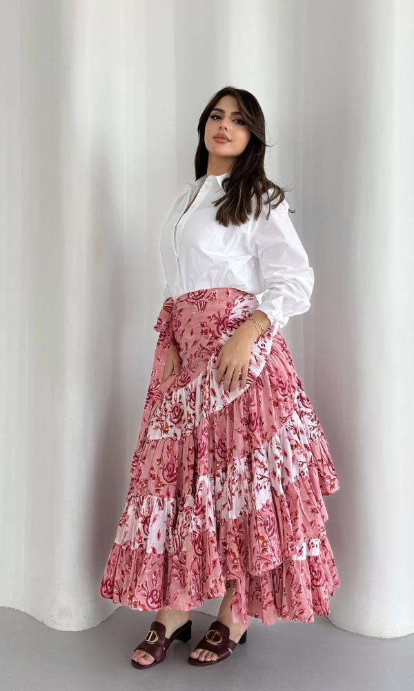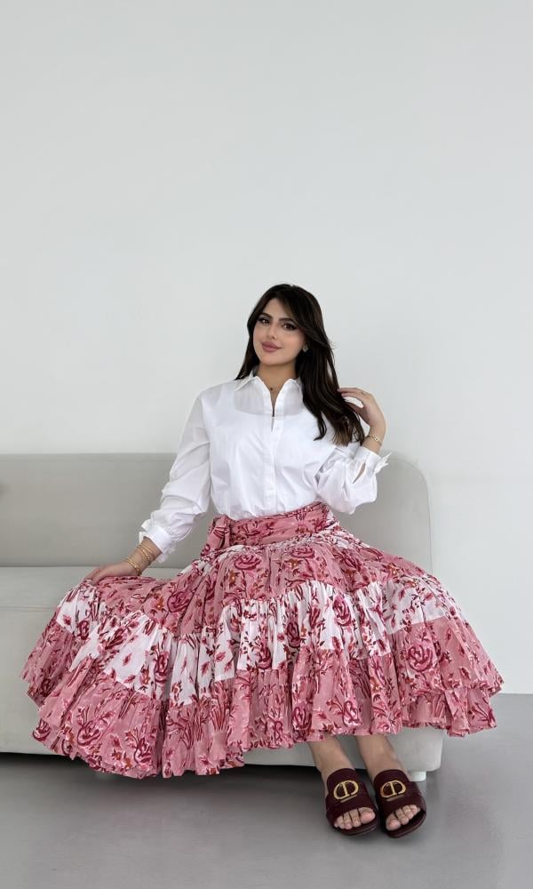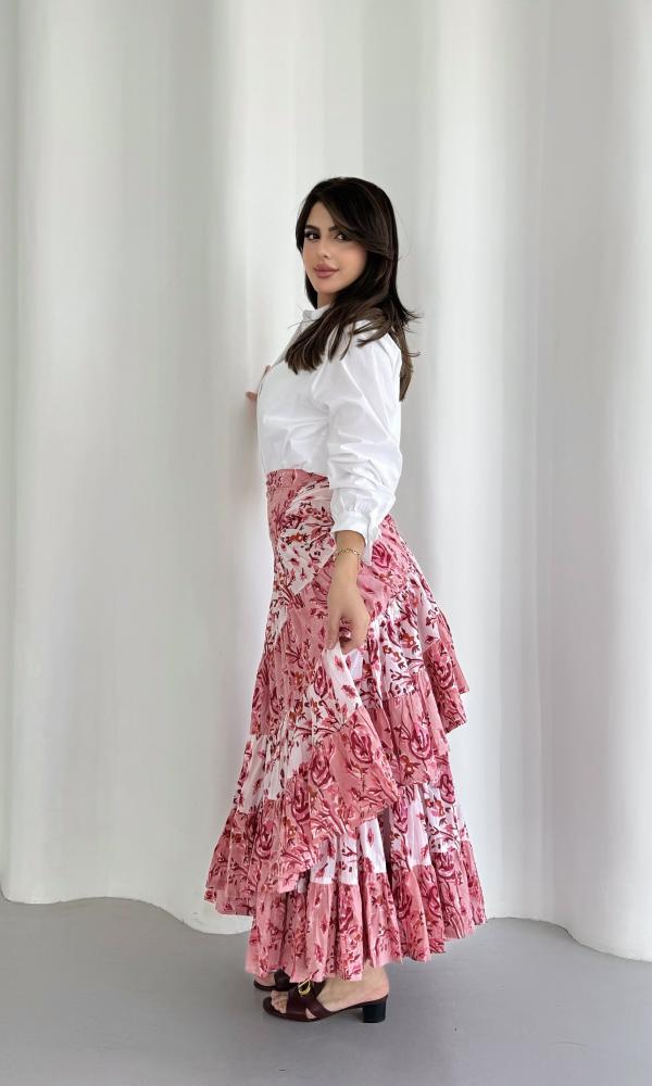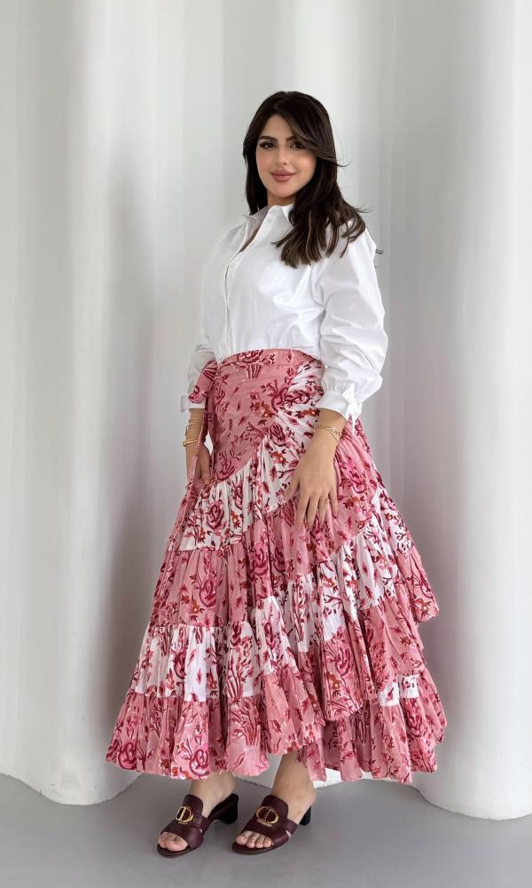 تنورة قطنية بتصميم لفّ (Wrap Skirt) تُربط حول الخصر بطريقة أنثوية أنيقة. تتميّز بقماشها القطني المريح والمزيّن بنقوش الورد على خلفية باللون الوردي والأبيض مما يمنحها طابعًا أنيقاً وانتعاشًا بصريًا. يُبرز تصميمها الطبقات المتدرجة (الكشكش) حركة انسيابية جميلة أثناء المشي كما يضيف الخصر العالي وطريقة اللف لمسة أنثوية تُبرز القوام بطريقة راقية وغير متكلّفة.