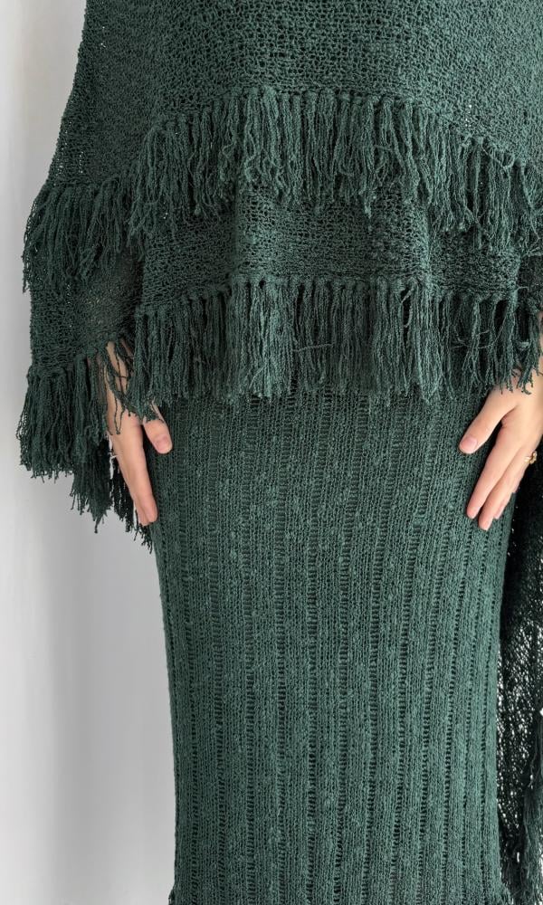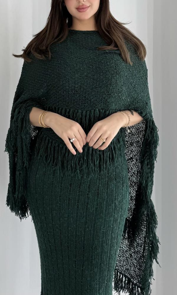 فستان من الصوف الناعم بتصميم مكوّن من فستان وكيب منفصل، مزين بهدب كثيف عند الأطراف يضفي لمسة دفء وأناقة، مع بطانة قطنية مريحة بلون متناسق لإطلالة شتوية فاخرة.