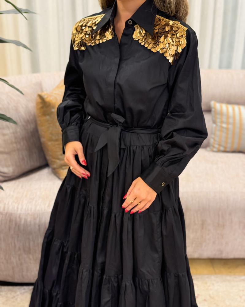 مصنوع من قطن هندي، ويتميز بتصميم أنيق وعصري، الجزء العلوي مزين بشك هندي راقٍ عند الأكتاف، مما يضيف لمسة فنية وجمالية للفستان، يأتي الفستان بتصميم كلوش، مما يمنح إطلالة متجددة ومريحة عند الحركة،كما يتضمن حزامًا يحدد الخصر، مما يعزز من شكل الجسم , يجسد الفستان الأناقة بأسلوب فريد.