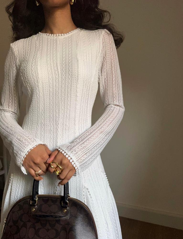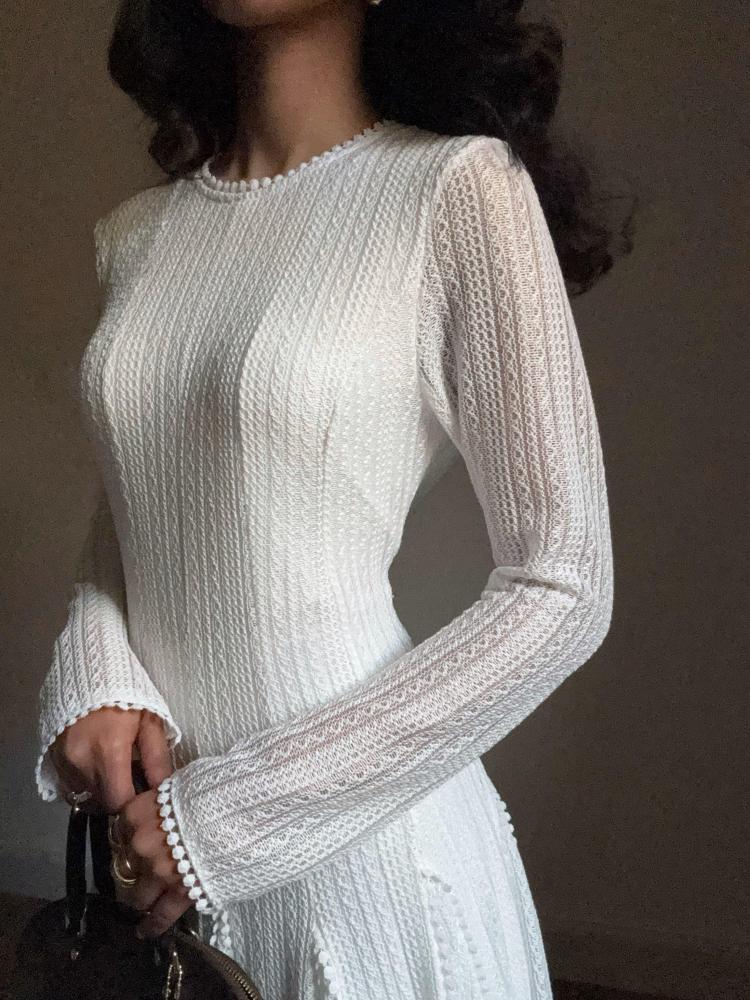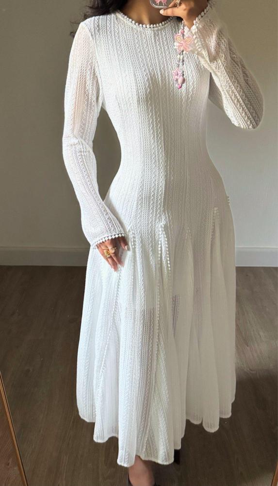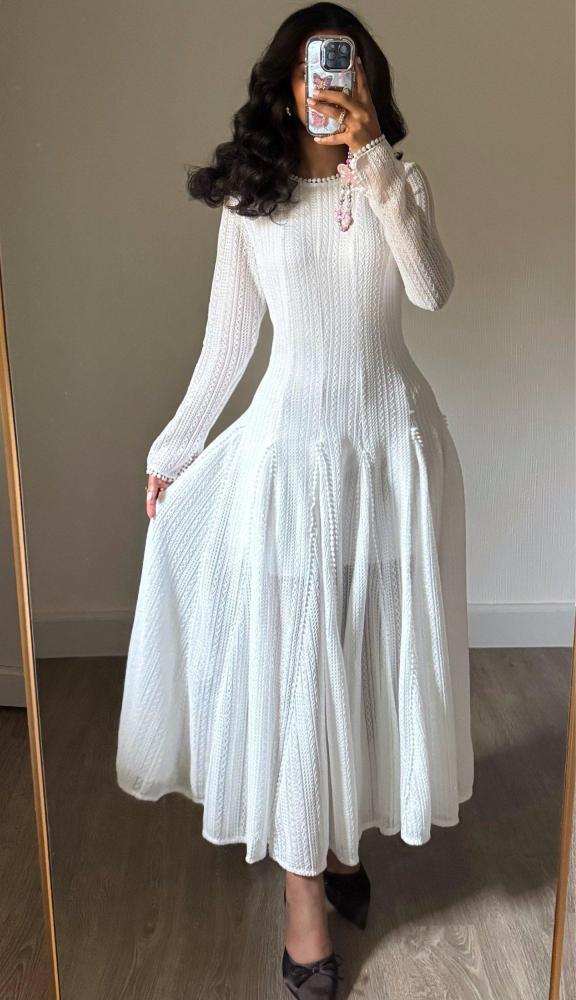 فستان "وايت تريكو" مصنوع من خامة التريكو المريحة. يتميز بتصميم مخصر يبرز الخصر، مع أكمام غير مبطنة، اللون الأبيض يمنح الفستان مظهرًا أنيقًا، مما يجعله خيارًا مناسبًا لمناسبات متنوعة.