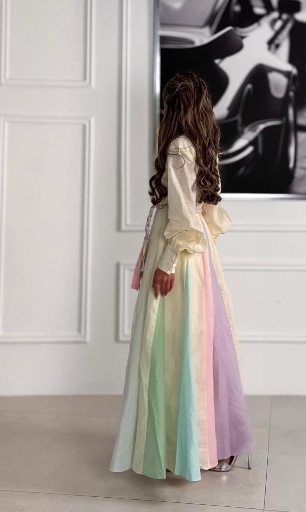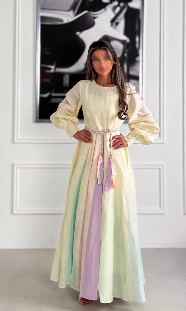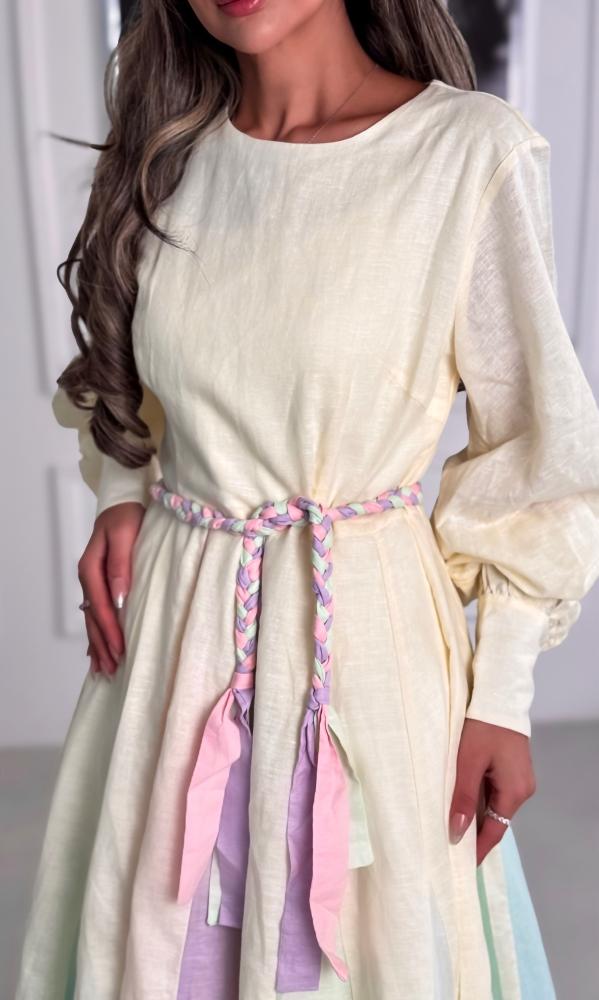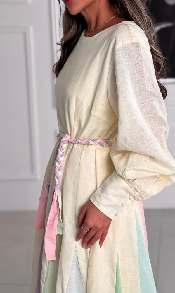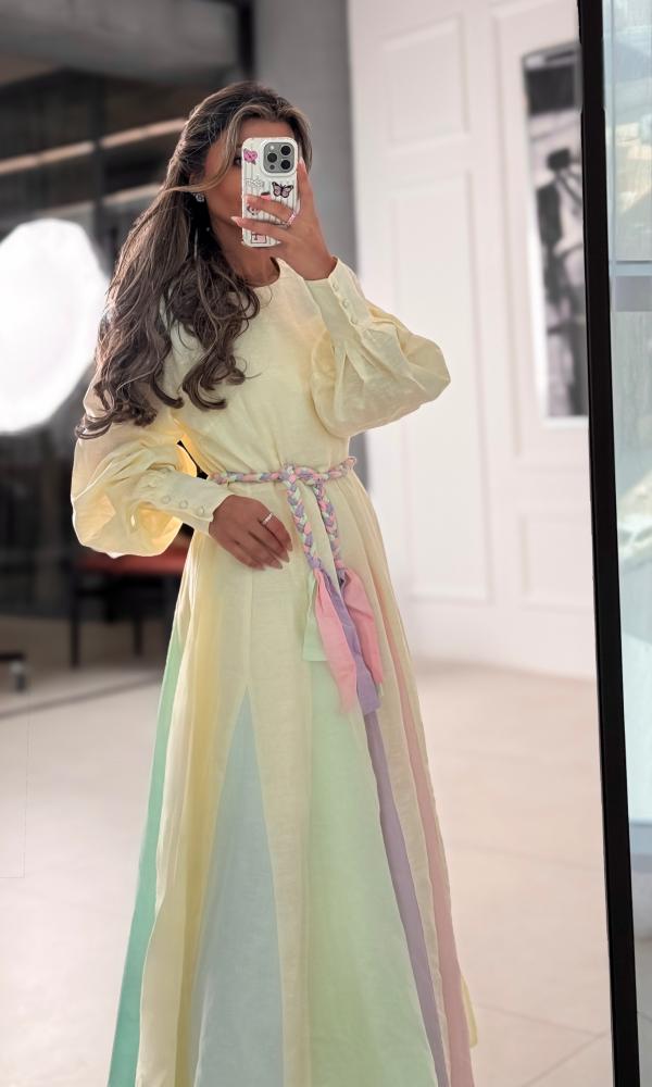 فستان أنيق وناعم مصنوع من مزيج قماش الكتان والقطن الطبيعي، يتميز الفستان بلونه الموحد في الجزء العلوي، مع تصميم بأكمام بف مع سوارة عريضة طويلة، أما الجزء السفلي فينقسم إلى ألوان باستيل هادئة موزعة بشكل طولي تمنحه حيوية ولمسة مرحة دون مبالغة، يتوسط الخصر حزام على شكل ضفيرة بألوان متناغمة، يربط بشكل أنثوي ليبرز القوام ويضفي لمسة مميزة على الإطلالة. تصميم فضفاض مثالي لأجواء النهار والمناسبات الخفيفة بطابع أنثوي ومريح.