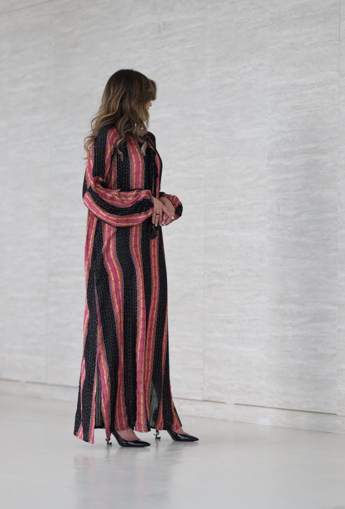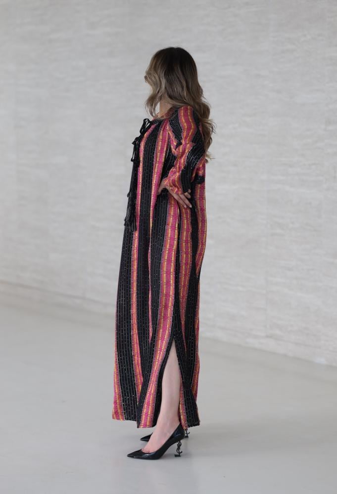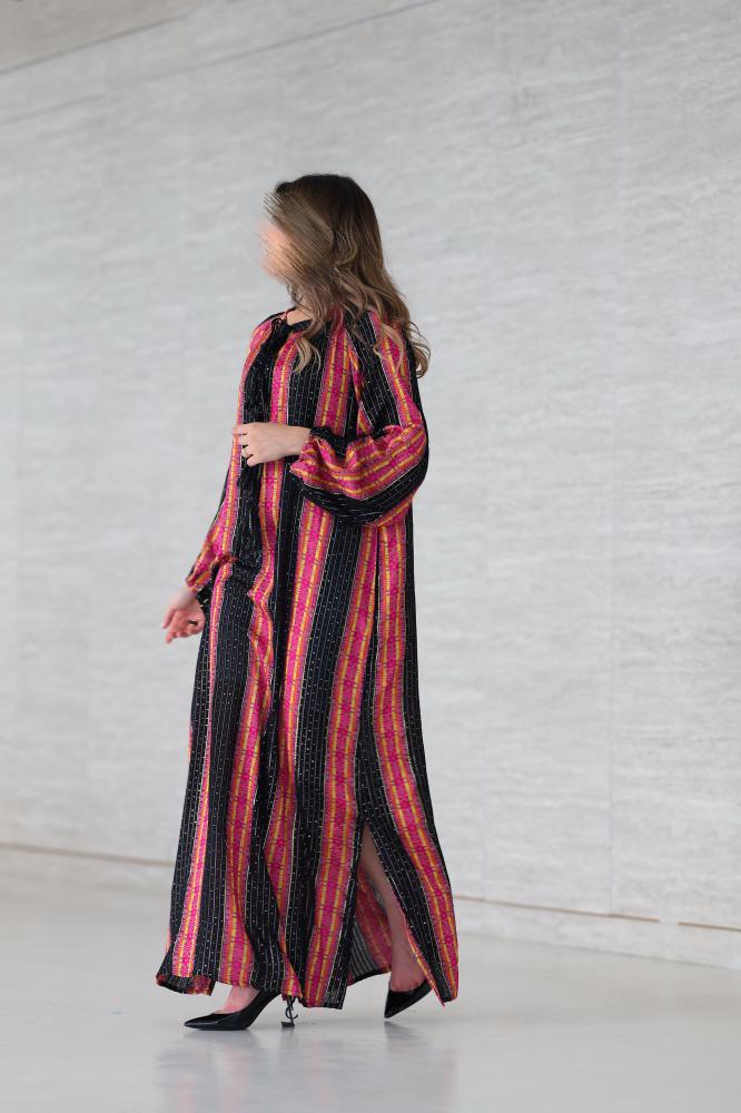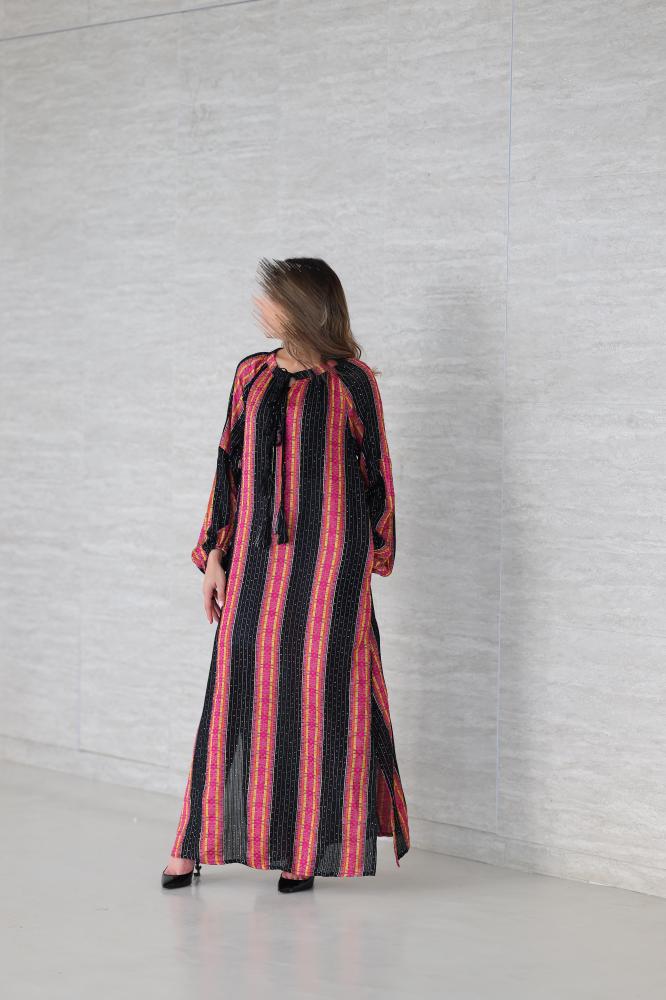فستان أنيق بطابع تراثي عصري مصنوع من قماش قطن وناعم يمنحك راحة وأناقة في آنٍ واحد يتميز الفستان بخطوط طولية تجمع بين الأسود والوردي والبرتقالي بتصميم مريح وعملي مع تطريزات لامعة , الأكمام طويلة وواسعة بنهاية مطاطية مزود بربطة عنق مزينة بشرّابات لمظهر أنثوي راق، تصميم الفستان واسع يلائم جميع الأجسام ويمنح إطلالة مريحة ومحتشمة.