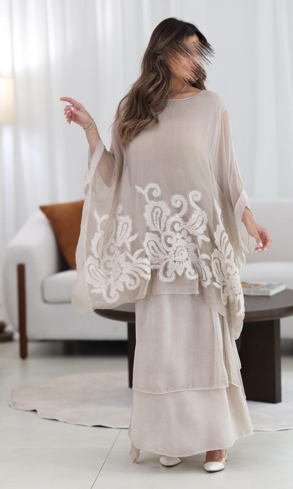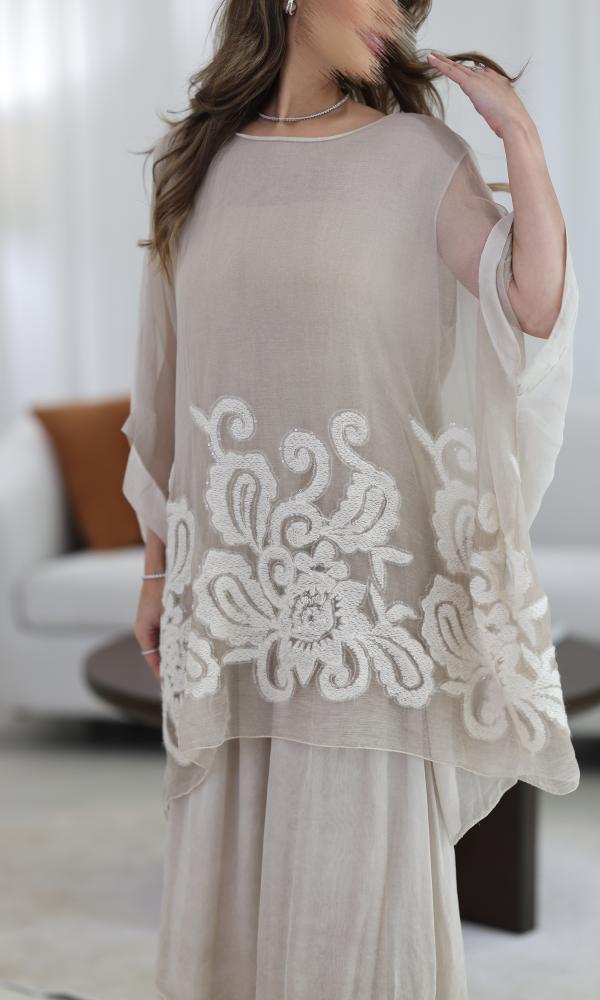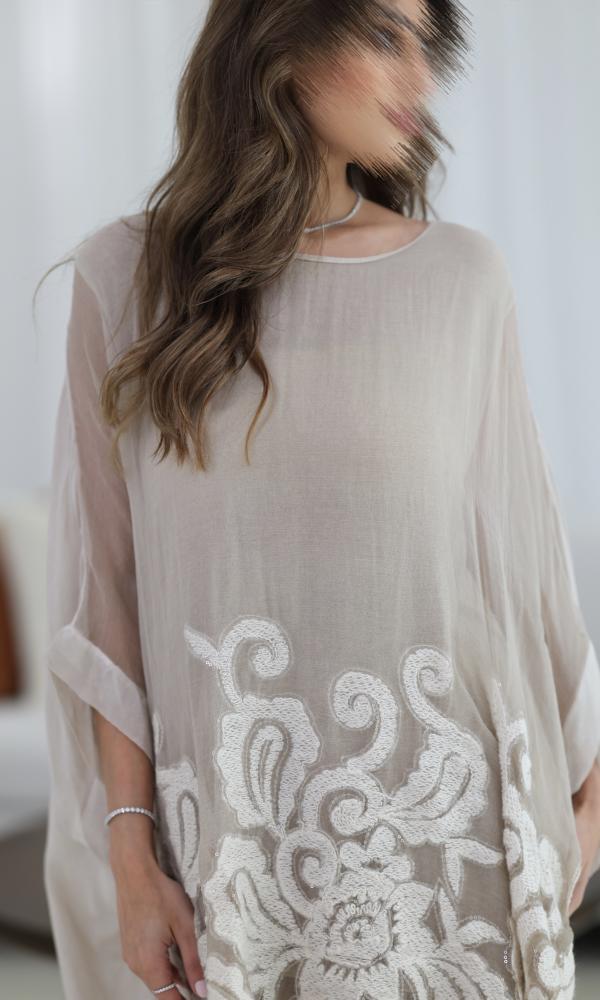 الجزء العلوي يأتي بقصة فضفاضة وانسيابية بأطراف غير متماثلة، مزين بتطريز يدوي ناعم بخيوط قطنية أو صوفية خفيفة تضيف لمسة فنية هادئة تشبه الزخارف.