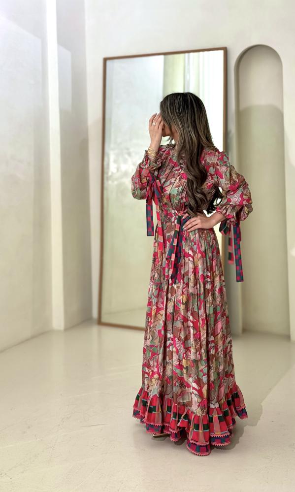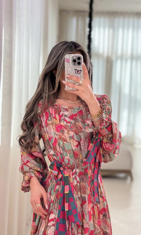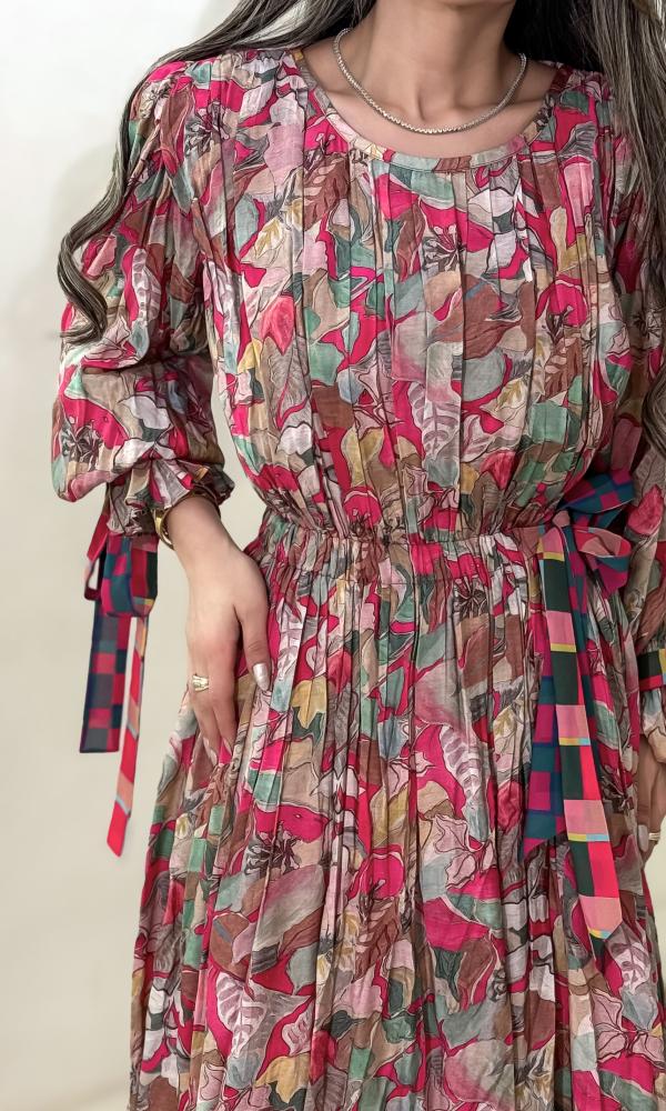 فستان بنمط أنيق ومفعم بالألوان، مصنوع من قماش قطن بارد بنقشات ملونه نابضه بالحياة. يتميز بتفاصيل مميزة عند المعصم والخصر، حيث يزينه مطاط وشريطة ناعمة تضيف لمسة أنثوية جذابة. تصميمه الطويل والانسيابي مزود بحافة سفلية مزخرفة بمربعات ملونة وحواف دقيقة، مما يجعله قطعة فريدة تعكس ذوقاً فنياً راقياً. بكم طويل وقصة مريحة، هذا الفستان مثالي لإطلالة نهارية حالمة أو أمسية بطابع مريح وأنيق.
