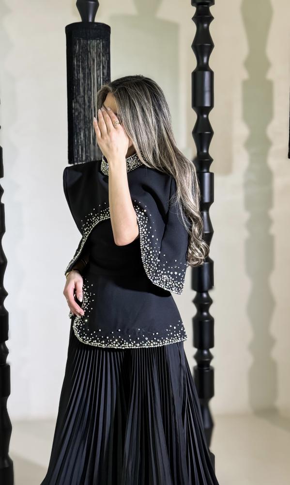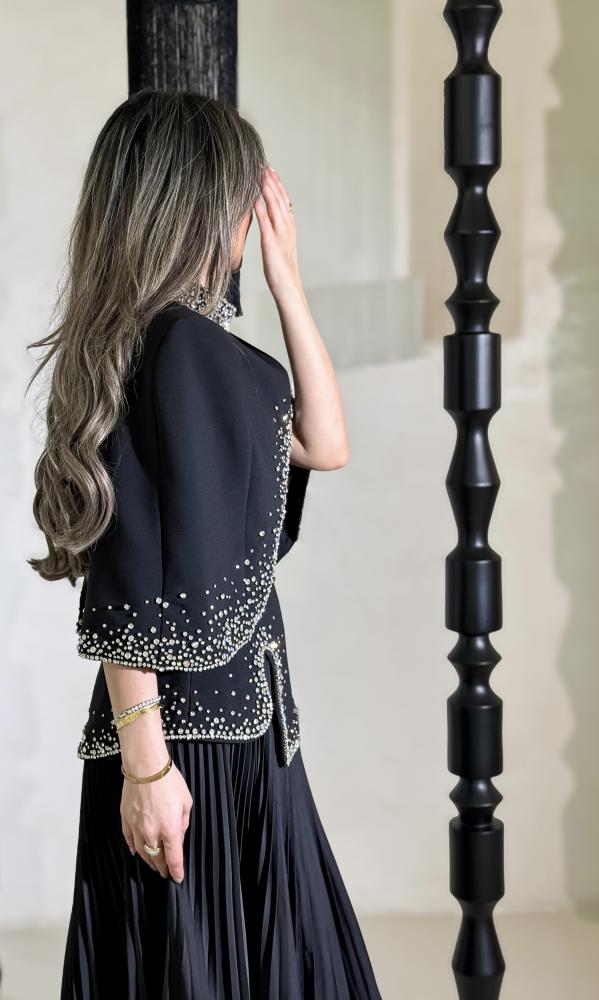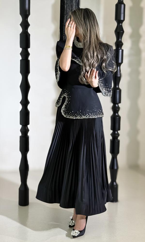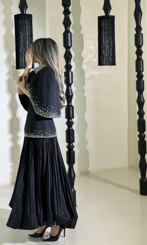 طقم سباركلز هو تجسيد للأناقة الهادئة التي تنطق بالفخامة دون جهد صُمّم الجزء العلوي من قماش الكريب بقصة كيب تنسدل برقة على الأكتاف، وتزدان بتطريزات كريستالية دقيقة تحيط بالياقة والحواف لتمنح لمسة لامعة تنبض بالأنوثة والرقي ، ينحدر التصميم بسلاسة نحو تنورة ساتان بليسيه بثنيات انسيابية تعكس الضوء بنعومة وتمنح الطقم حركة راقية في كل خطوة ، خيار ملائم لذوق المرأة التي تبحث عن التميّز في أبسط التفاصيل.