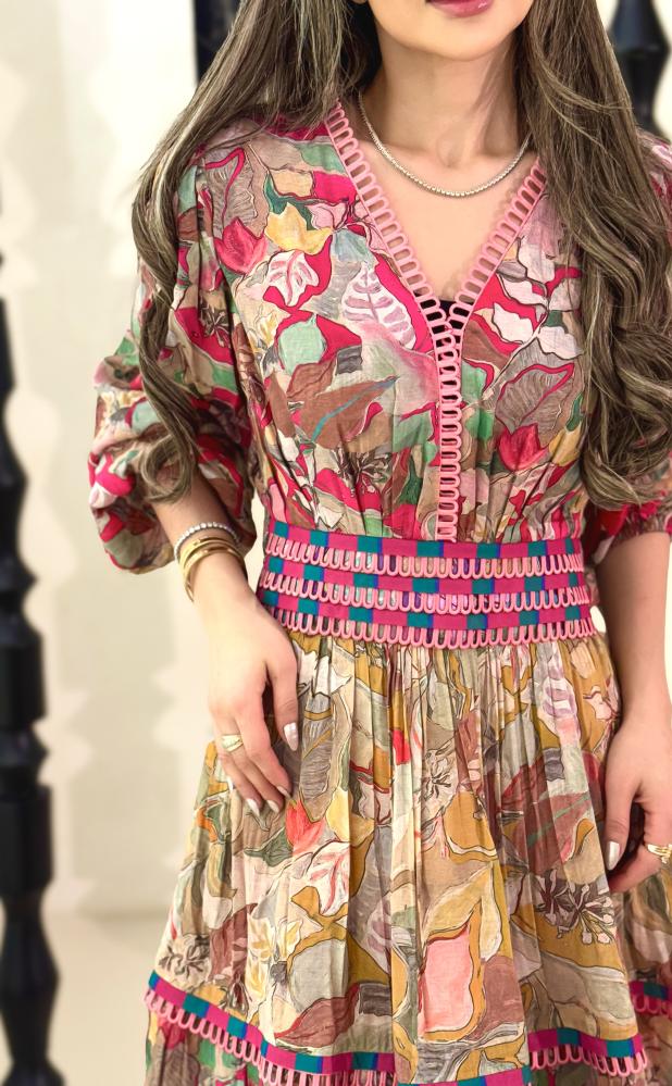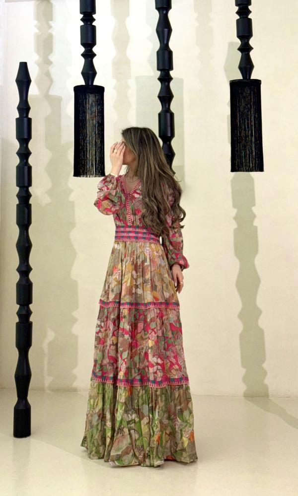 فستان بطابع بوهو أنيق، من قماش قطن بارد بنقشة أوراق وزهور ملونة مستوحاة من الطبيعة، يتميز بتفاصيل شغل يدوي دقيق على الصدر والخصر باستخدام شرائط وردية وحواف مطرزة تعكس لمسة فنية فريدة.تصميم واسع وانسيابي بكم طويل، مثالي لإطلالة نهارية راقية أو أمسية بلمسة مريحة وملفتة