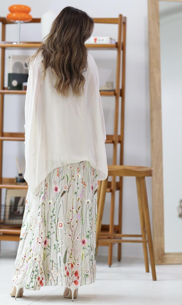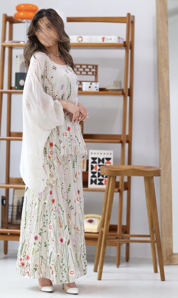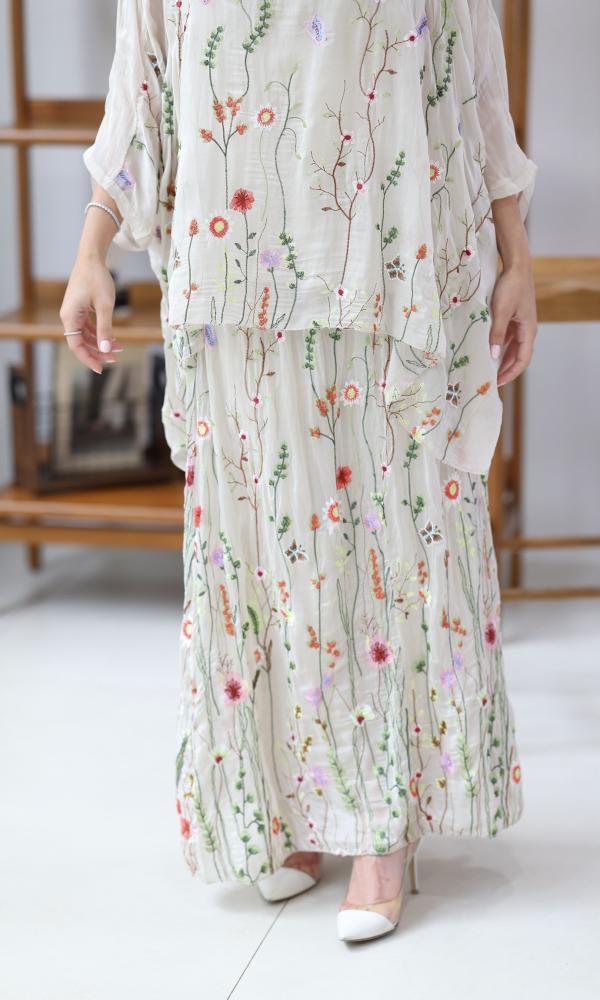 طقم مكوّن من قطعتين مصنوع من قماش الحرير الفاخر ببطانة داخلية من القطن لضمان الراحة. الجزء العلوي يأتي بقصة فضفاضة وانسيابية بأطراف غير متماثلة، يتميز الطقم بتطريز متقن يغطي كامل التصميم برسومات أزهار ملونة مستوحاة من الطبيعة، بألوان متعددة، كالأحمر، البنفسجي، والزهري، تضيف لمسة فنية هادئة تشبه الزخارف. أما التنورة تأتي بخصر قطن مطاطي وطول متوسط تضفي حركة وانسيابية ناعمة عند المشي.