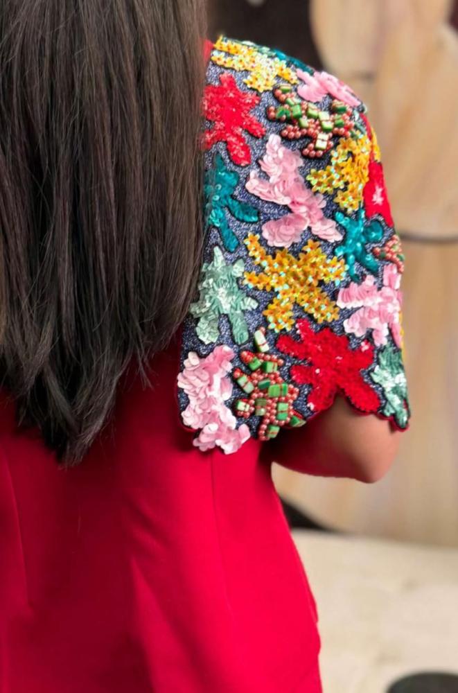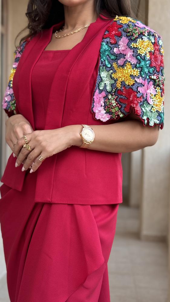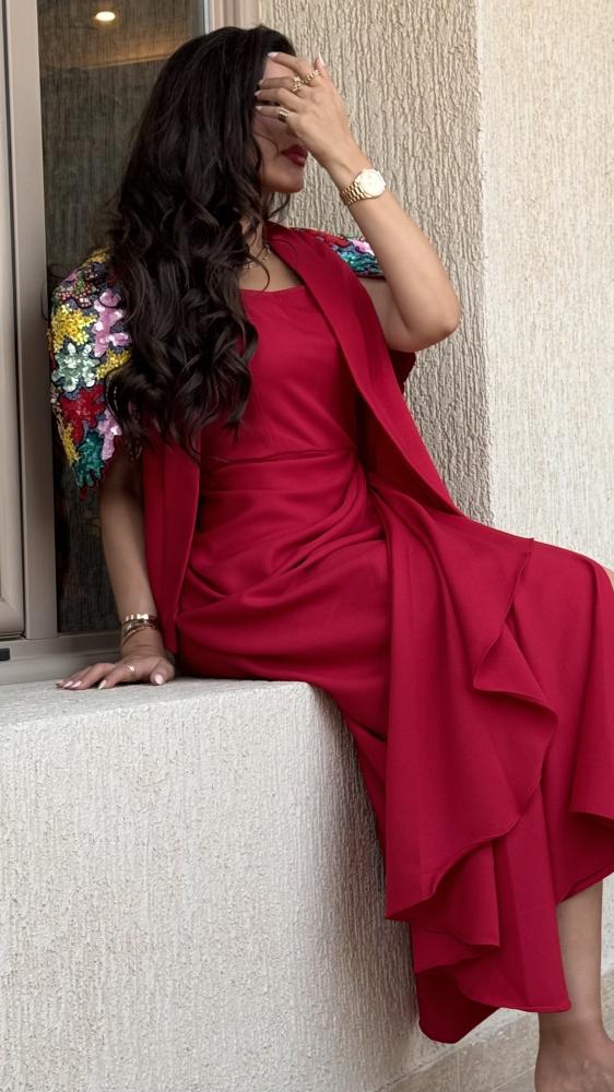 تألقي بإطلالة عصرية تخطف الأنظار مع فستان ريد شارم، هذا التصميم المكون من قطعتين يجسد الأناقة العصرية و الرقي. تتألق القطعة الداخلية بفستان أحمر جذاب وضيق يبرز جمال قوامكِ، يتميز بقصة رائعة مع طيات دقيقة أنيقة تتجمع حول منطقة الخصر لتمنحكِ مظهرًا أنثويًا ساحرًا. أما القطعة الخارجية فهي كيب فاخر يضفي لمسة ملكية على الإطلالة، مزين بتطريزات زاهية وبراقة تضفي بهجة وحيوية على التصميم. تتناغم الأكمام الواسعة للكيب بشكل مثالي مع الفستان الداخلي الضيق، لتخلق تباينًا أنيقًا يمنح الإطلالة طابعًا فخمًا ومميزًا.